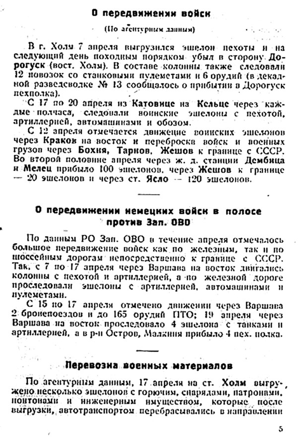 «Разведывательное управление Генерального штаба Красной Армии сообщает, что германское командование, усиливая группировку войск в приграничной с СССР полосе за счет массовых перебросок войск из глубинных районов Германии, оккупированных стран и с Балкан, в то же время занимается и маневрированием, перебрасывая отдельные части в пограничных районах из одного населенного пункта в другой, чтобы ввести нас в заблуждение в оценке действительного наличия войск.