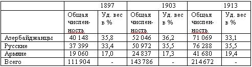 м миграции русских из центральных губерний России, а также армян в Бакинский промышленный район, удельный вес азербайджанцев в общей численности населения города несколько сократился. В результате, по данным на 1 января 1913 года, доля азербайджанцев в общей численности населения Баку сократилась до 33,1%, в то время как доля русских и армян выросла, соответственно, до 35,5 и 19,4%.