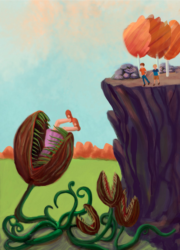 Мы с Витькой переглянулись и сломя голову побежали в сторону зовущего на помощь. Из-за деревьев выглядывали огромные бутоны коричневых цветов в белую полоску. Наивные бабочки, пролетая мимо них, оказывались в их пасти. Цветы плотоядно поглощали всё, что было возможно. Если что-то пролетало мимо них, стебли вытягивались, и бутон сразу же съедал свою жертву. В воздухе образовался запах опасности, который оглушал нас своей тревожностью.