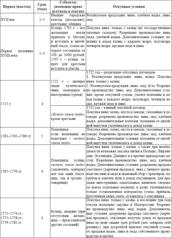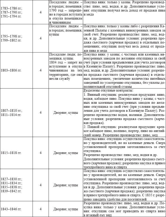 С 1761 года откупные контракты следовало заключать уже на пять лет, то есть по 1766 год[747]. Позднее четырехлетний срок был восстановлен и не изменялся вплоть до второй половины XIX века.