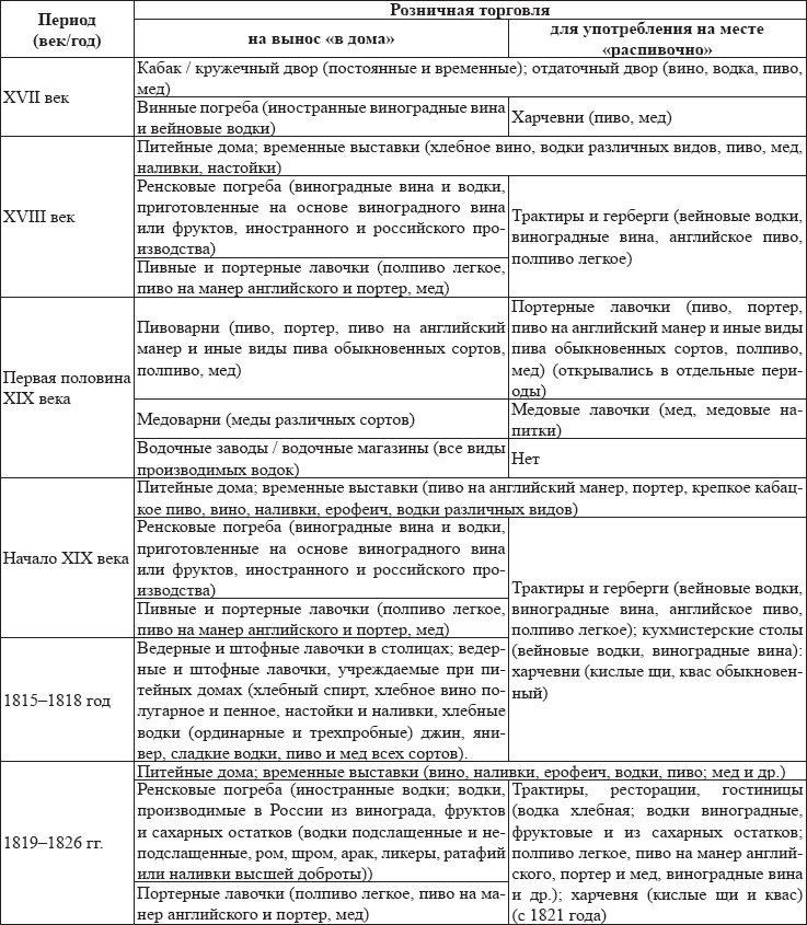 Места розничной продажи алкогольных напитков, виды реализуемых алкогольных напитков в XVII – первой половине XIX вв., начале XXI века