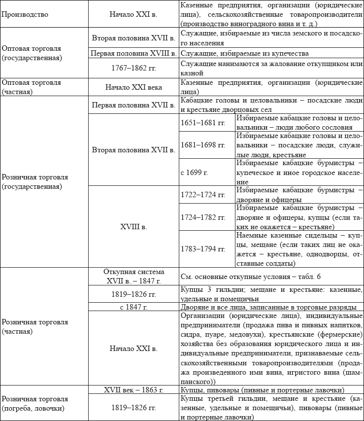 Субъекты, осуществляющие производство и оборот алкоголя в XVII – первой половине XIX вв., начале XXI века