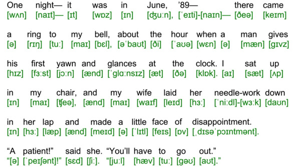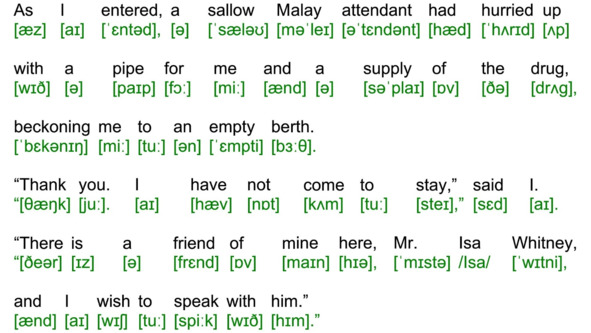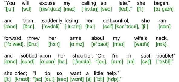 В данном пособии приводится текст рассказа А. К. Дойла «Человек с рассечённой губой» на английском языке с транскрипцией. Текст рассказа разбит на небольшие фрагменты. Для каждого фрагмента подготовлена транскрипция, оформленная в виде иллюстрации с изображением транскрипции текста фрагмента. Фрагменты пронумерованы порядковыми номерами (001, 002,…,245). Для каждого фрагмента создан видеоролик – презентация данного фрагмента. Адрес видеоролика приведён после номера фрагмента. С видеороликами можно работать как в режиме on-line, так и в режиме off-line, предварительно скачав их. Адрес папки с видеороликами: