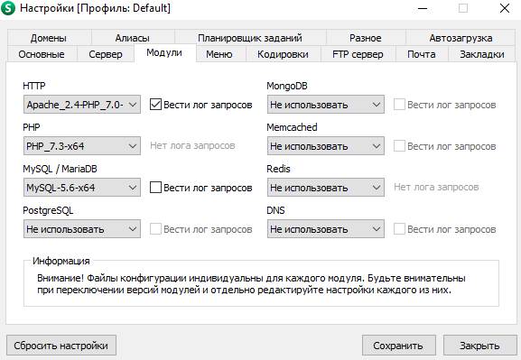 Разработка ведется локально, поэтому нужен сервер. Здесь все просто: Open Server. В нем уже встроено все, что нужно в данной ситуации. А именно: Apache, PHP, MySQL, phpMyAdmin и отправка писем с сервера. Поэтому идем на сайт разработчика https://ospanel.io/. Качаем нужную версию. Устанавливаем. Запускаем. Щелкаем на значке «Open Server» в виде флажка и переходим на вкладку «Настройки» затем «Модули». Выбираем нужную версии языка PHP желательно самую последнюю, она будет зависеть от версии Windows установленной на вашем компьютере, выбираем модуль Apache, программы, которая позволяет пользователю просматривать веб-документы, совместимый с версией PHP и нужный модуль базы данных MySQL.