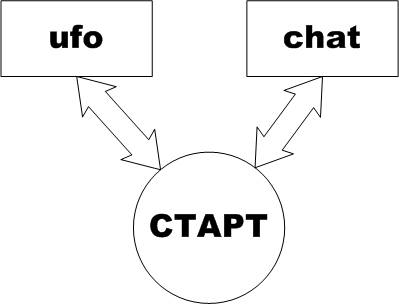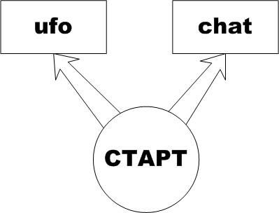 Движение из точки старт возможно только в одном направлении. Или налево или направо. Мы не можем взять предметы в месте chat и затем отвезти их в место ufo. Если автомобиль выезжает из позиции старт в направлении ufo и по прибытии в ufo обнаружится, что нужные предметы для этого места отсутствуют, то все. Мы оказались у разбитого корыта. Вернуться назад за нужными предметами мы не можем. Движение одностороннее.
