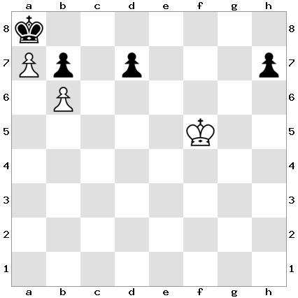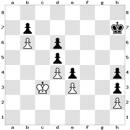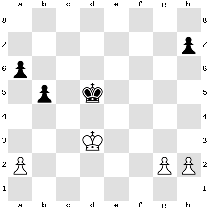 Если в позиции будет ход черных, они попадут в невыгодное положение, так как не смогут препятствовать вторжению в свой лагерь белого короля. Таким образом, задача белых сводится к тому, чтобы передать ход сопернику.