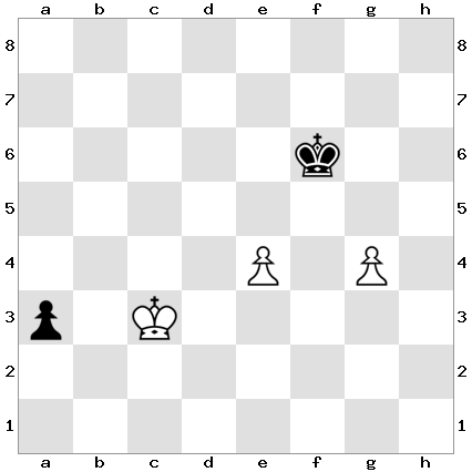 На первый взгляд, кажется, что черные достигают ничьей. Их король находится в квадрате изолированных пешек “е4” и “g4”. Белый король сторожит пешку “а3” и на помощь своим пешкам придти не сможет. Однако это не так. В данном случае правило квадрата не применимо. На ход черных 1…Кре5, ответ белых. 2. g5! На ход 1…Крg5. 2. е5! И пешки в состоянии себя защитить – при взятии одной из них король выйдет из квадрата другой. Пешка же черных гибнет. Выигрыш.
