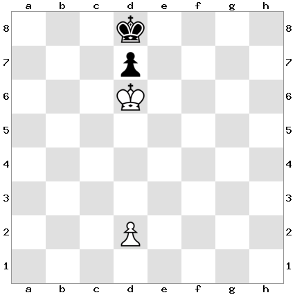 1. d4 Кре8 2. Крс7 d5 (жертва пешки дает возможность занять оппозицию, плохо 2…Кре7 ввиду 3. d5 Кре8 4. d6 с выигрышем) 3. Крс6 Кре7 4. Крd5 Крd7 ничья