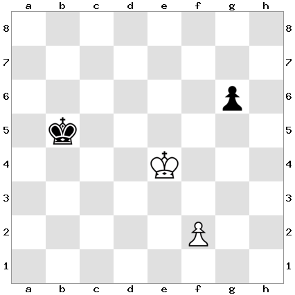 Значит, король белых должен располагаться таким образом, чтобы иметь возможность атаковать неприятельскую пешку “g” и продвигать свою пешку “f”, не подвергая ее нападению черного короля. Это можно осуществить, если король белых будет расположен на расстоянии хода коня от короля черных, т.е. займет коневую оппозицию.
