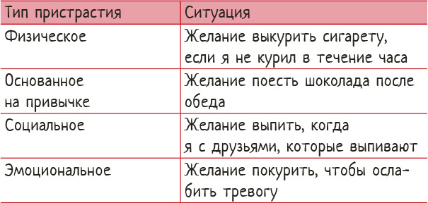 УПРАЖНЕНИЕСтимулы, запускающие пристрастиеВыясним, когда у вас проявляются пристрастия. Осознание пристрастий и понимание того, почему они возникают, – это первый шаг к эффективному управлению своими пристрастиями и жизнью. Это первый шаг в разработке плана. В приведенной ниже таблице даны примеры распространенных пристрастий. Запишите в дневнике или блокноте каждый тип пристрастий (физические, основанные на привычке, эмоциональные, социальные) и перечислите как можно больше ситуаций, когда вы испытываете сильное желание употребить какое-либо вещество. Или же начните с перечисления ситуаций, в которых проявляются пристрастия, а затем решите, какой тип пристрастий соответствует каждой ситуации.