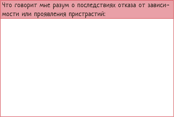 УПРАЖНЕНИЕМифы о пристрастияхНаш разум способен убедить нас в том, что может произойти много чего плохого, если мы отпустим зависимости или если проявятся пристрастия. Подумайте о том, что говорит вам ваш разум. Запишите некоторые из этих мыслей в блокнот или на бланке.