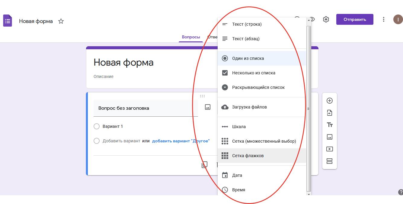 Обратите внимание на меню видов вопросов. По умолчанию там – «Один из списка». По щелчку раскроем меню. Увидим такой ассортимент типов вопросов: