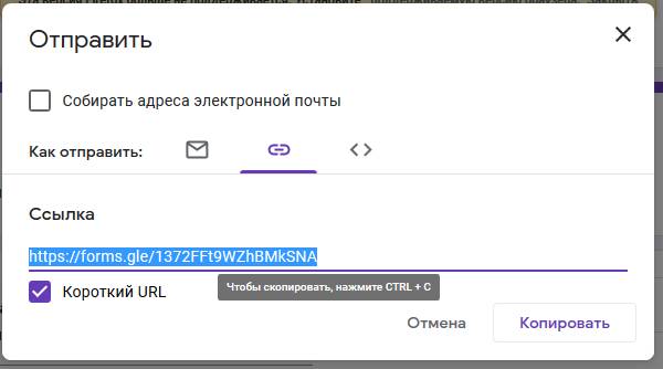 Если вы выбрали вариант «Ссылка», то копируете ссылку, по которой будет предложено перейти для заполнения анкеты. Ссылку доводите до сведения тех людей, от которых требуется заполнить анкету. Либо размещаете на какой-либо странице в Интернете, все желающие посетители которой будут иметь возможность заполнить анкету. Поставив галочку в поле «Короткий URL», вы получите более короткий вид той же самой ссылки: