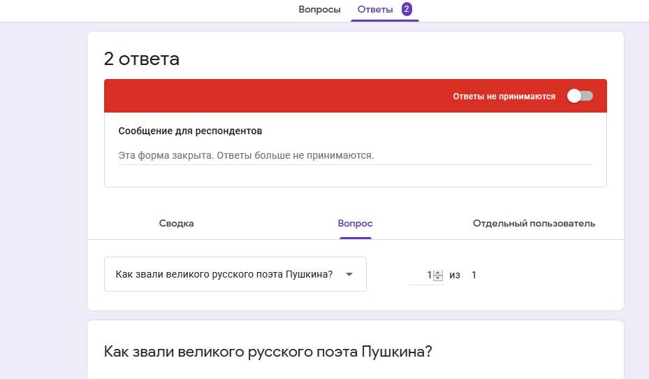 Вот так мы увидели, какие ответы получили на наш вопрос. Обратите внимание, что переключатель стоит в положении «Принимать ответы». Предположим, что мы больше не хотим, чтобы на нашу анкету продолжали отвечать. Переключаем в положение «Не принимать ответы». Вот что увидим мы, авторы анкеты:
