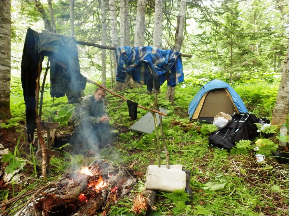 Дошел до поворота. Речушка Ичара уже бежит с северо-запада. Пошел по не большому притоку, бегущему с северо-востока. Нужно где то разбивать бивуак. А вот где здесь стать на две ночи? Место под палатку нашел, дров не нашел. Да уж, местность не бивуачная. Вокруг бамбук, береза, молодая ольха, да ива. Сушняка ноль. Нет смысла лезть выше. Немножко сушняка нашел. Сушить сапоги придется на сырце.