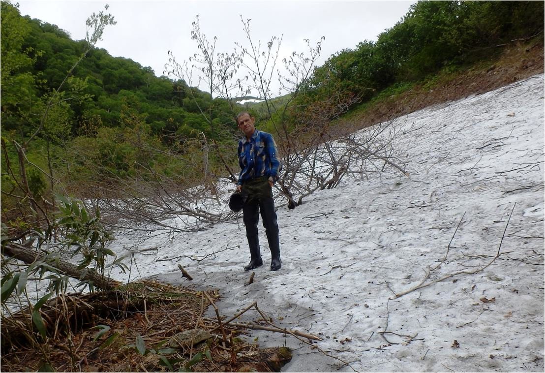 На северо-востоке стала просматриваться гора Ичара, вершина в тумане. Может и вправду погода будет? Завтра нужна погода. В одиннадцать тридцать сделал обед, прошел четыре часа. После обеда тоже самое, где берегом, где поймой. На левом берегу стали попадаться снежные пятаки. Возле склона сопки, зеленка только полезла. Хоть какое-то облегчение. Гора уже на востоке, таежник потихоньку обходит гору. Зайдет на гору с северной стороны.