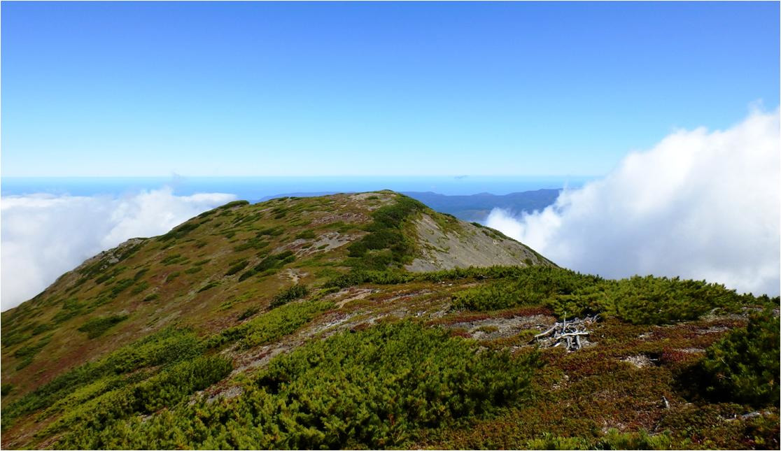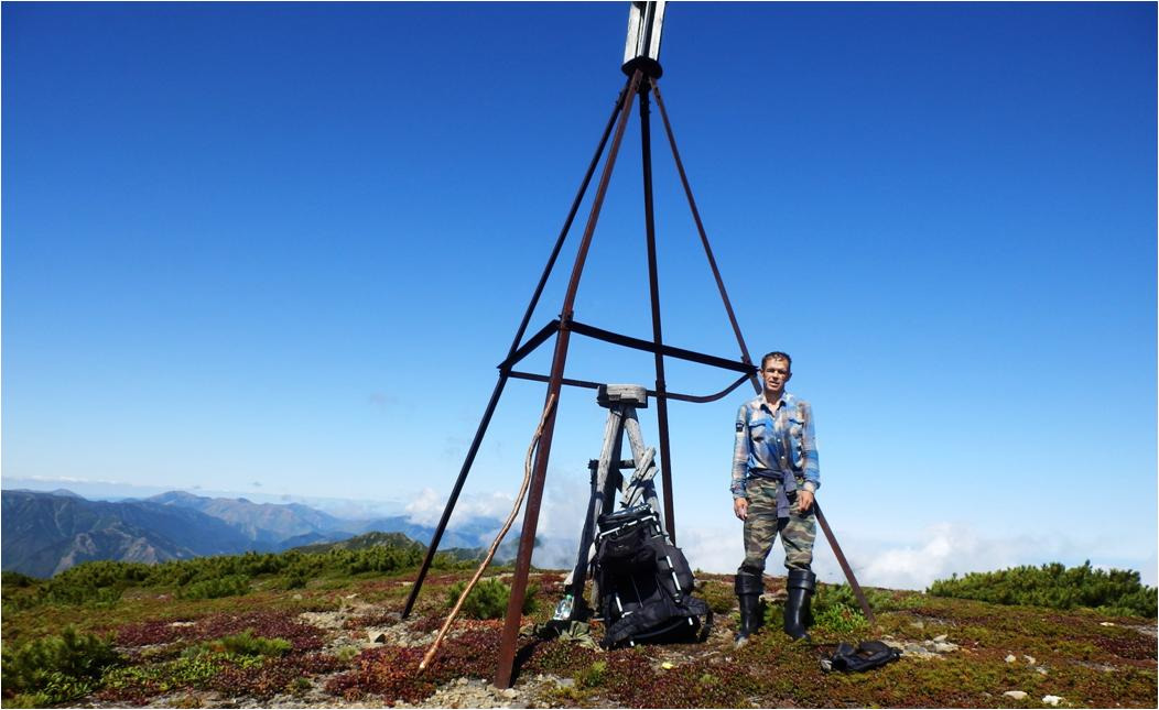 Залез на отрог. Со стороны Пурш-пурша гонит туман и не черта там не видно. Дотащился до треноги, сбросил рюкзак. Ура, Тимоха победил! Да как-то и не ура, да потому что сил нет, кончились силы. От базы потратил четыре с половиной час. А ведь не плохой результат. Нечего себе не плохой, отличный результат. Гору Лопатина хорошо видно, море Охотское видно.