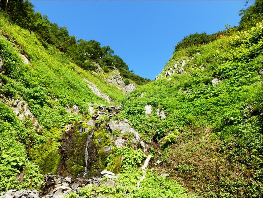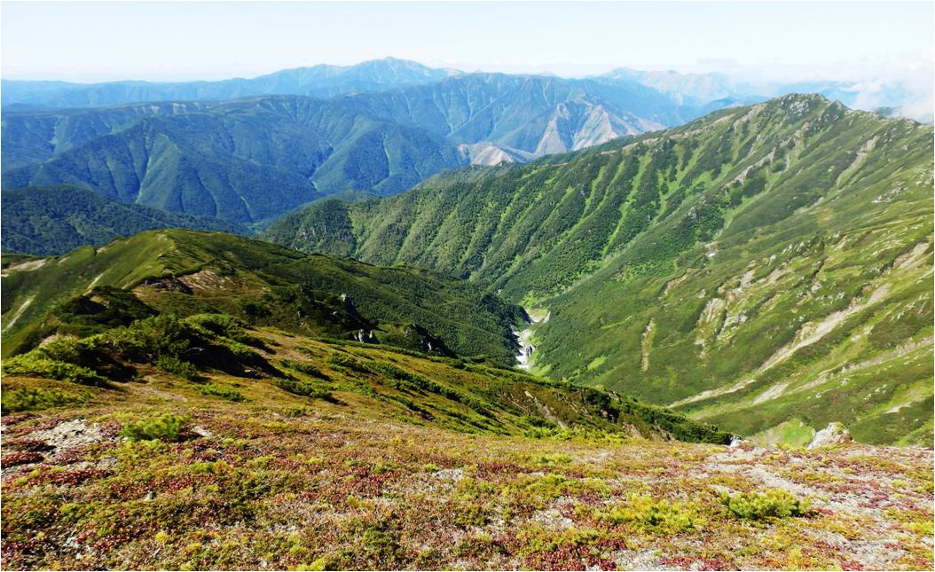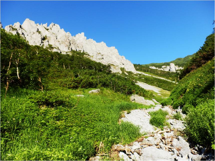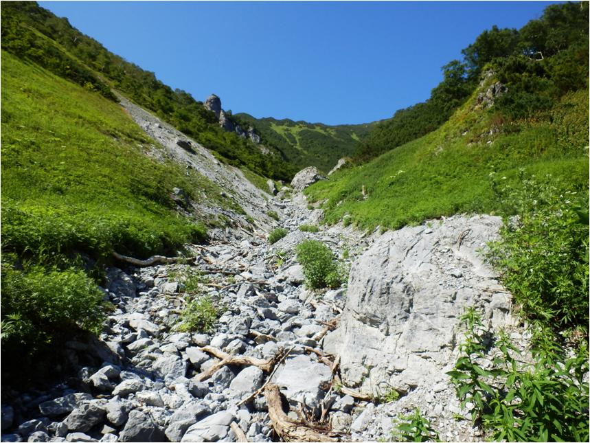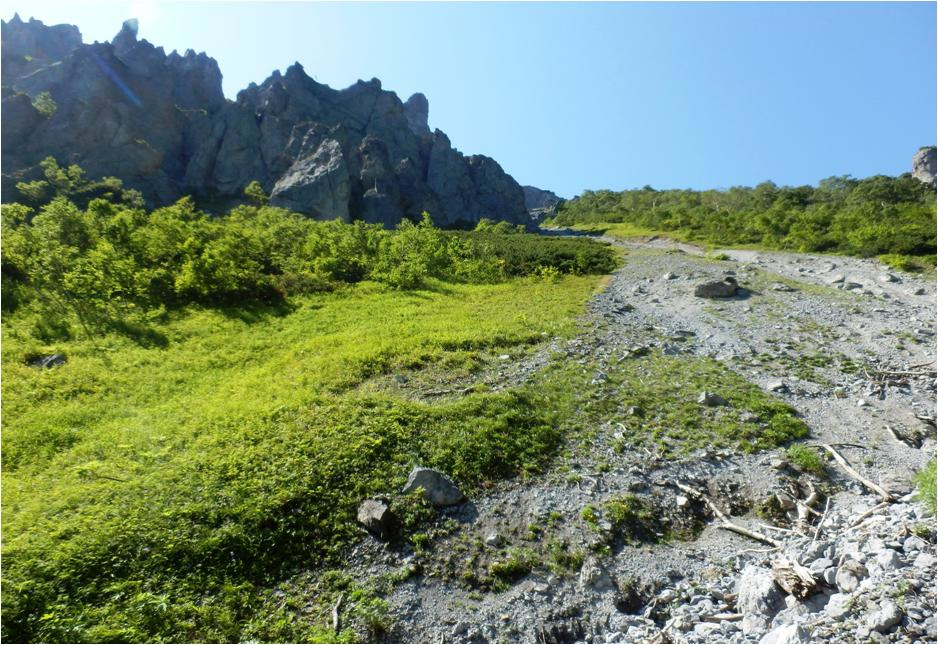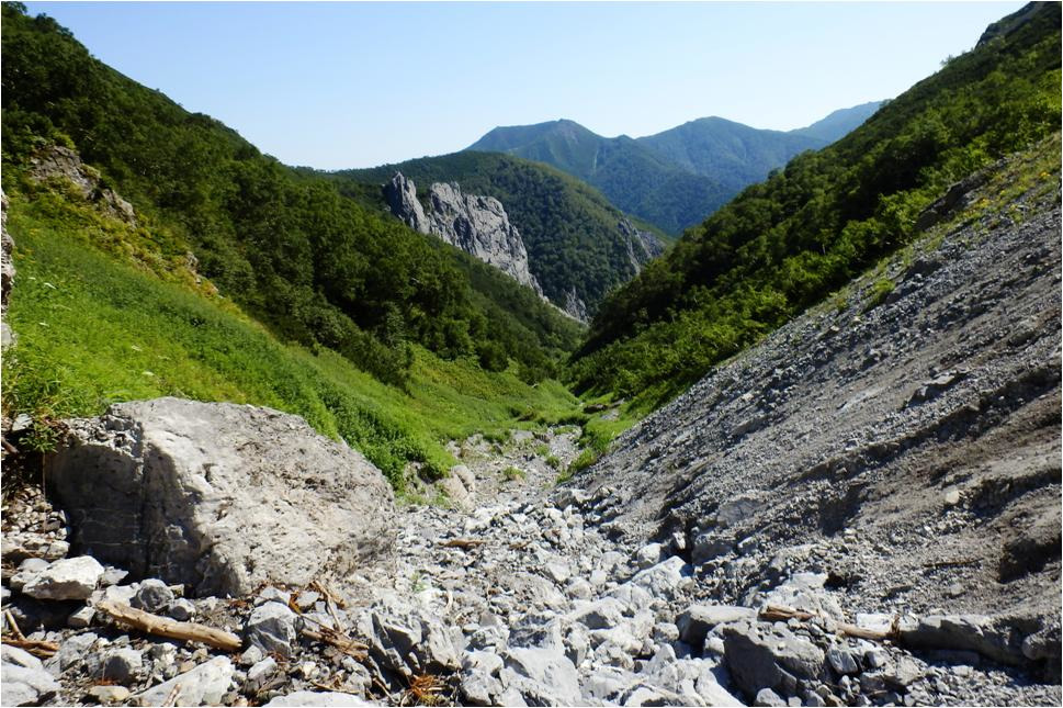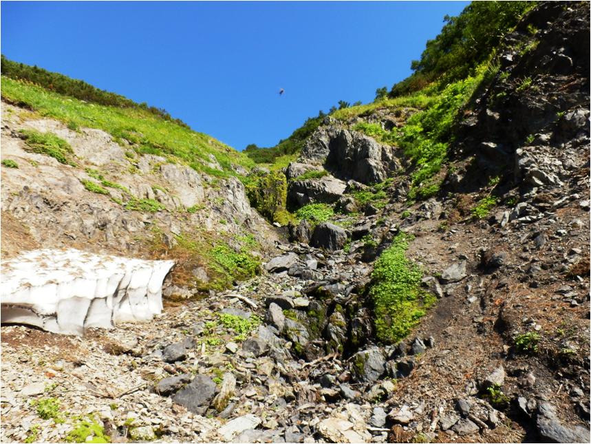 Добрался до основного распадка. Кое-как на него спустился. Распадок по которому лез вниз, на выходе обрывается отвесом метров за восемь. Трава закончилась, пошли гольцы, камни, перепад, на перепаде.