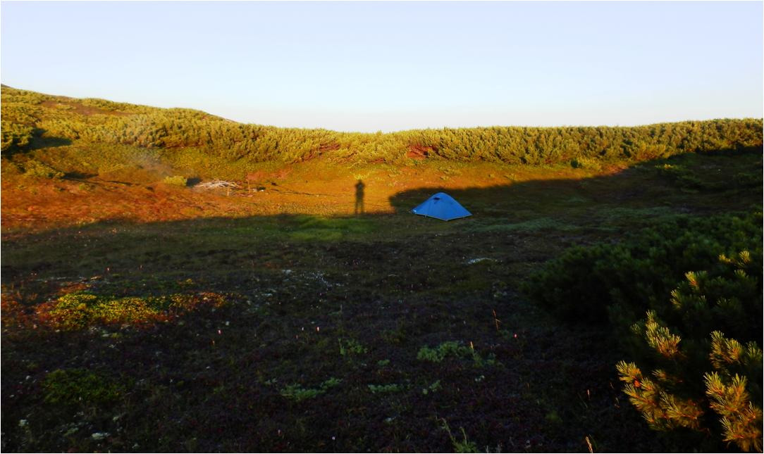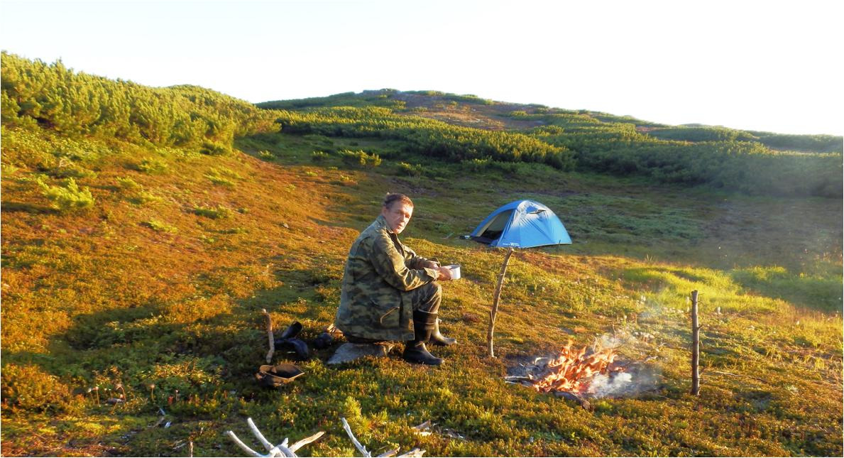 Определил место под палатку. Рогачки на костер и колышки на палатку из стланика. С берестой туго, нет в запасе бересты. Насобирал мелких стланиковых дров, настрогал ножом щепы, сделал огонь. Снял сапоги. Обул сандалии, сапоги с носками на ветерок. Как приятно ногам. Попил чая с печеньем и с маслом. Время всего четыре часа. Поставил палатку, разложил вещи. Насобирал дров. Пошёл на экскурсию. Уже понял, где находиться каменный город. Пошёл в сандалиях, здесь можно ходить в данной обуви. В стланик только не залазить.