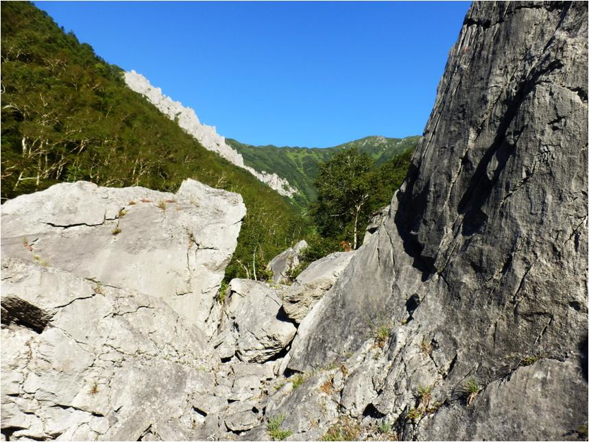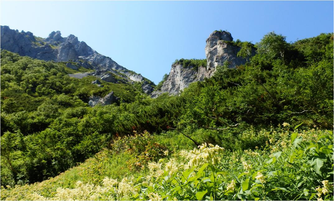 Наметил начало спуска. Падать придется не по основному распадку. Таёжник чувствует, что по основному распадку будет конкретный не пропуск, нагромождение каменных глыб. Не видно, что твориться за кривуном внизу. Зато видно, что твориться наверху кривуна. Высокие отвесные скалы.