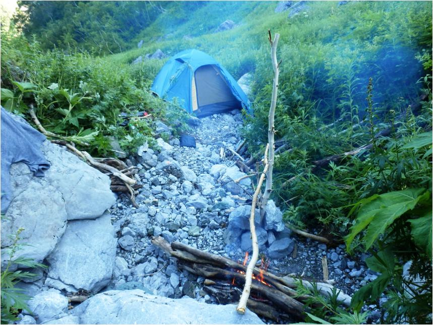 Вернулся на бивуак, кстати, сверху видно базу лавиньщиков. Резко, однако, похолодало. Ночь будет холодной. Естественно, ведь бивуак не в пойме и не в ельнике, а на высоте почти в полторы тысячи метров. Снова попил чая с печеньем и маслом. Воды осталось на утро.