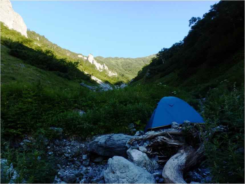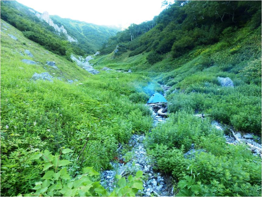 Полазил по склонам, ломая зелёнку, нет не чего подходящего. Нету не большого, хотя бы относительно ровного пяточка под палатку. Решил ставить палатку на русле ручья. Не затопит, чтоб здесь побежала вода, нужны снега или затяжные проливные дожди дня на три. Выравнивал место под палатку, наверное, полчаса, пришлось и камни таскать. Сам не какой, нет, чтоб чая попить. Срочно палатку ставить, дождь что ли вот-вот ливанет? Дождя не предвидится.