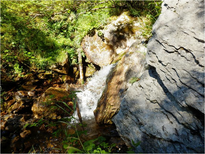 Бежит маленький ручеёк. Вот тут все и началось. Водопады через каждые двадцать метров, а иногда по три четыре водопада лесенкой. Лесенка, правда, для великана. Пороги, фактически на каждом шаге. Скорость движения, продвижения ещё уменьшилась. Руки заболели, на посох тоже нагрузка сильная. А без посоха здесь труба! Гиблое место. Тут не только ноги, шею можно поломать, раз плюнуть. Внимание предельное, учитываются все мелочи. А полтора месяца назад, весь это ужас был спрятан под снегом, лети вниз на сближение с каменным городом и жизни радуйся.