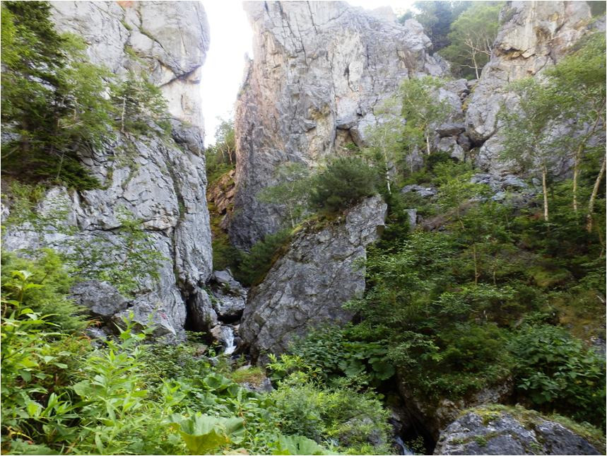 Стоят отвесные светло-серые скалы, высотой, наверное, метров по восемьдесят. Узкая щель, летит довольно приличный ручей. Это приток, который берет истоки с самой горы Граничной. Если от тригапункта падать на восток, то на приток Скальный выйдешь вот через эту каменную щель, расположенную на восточном крае среднего каменного города.