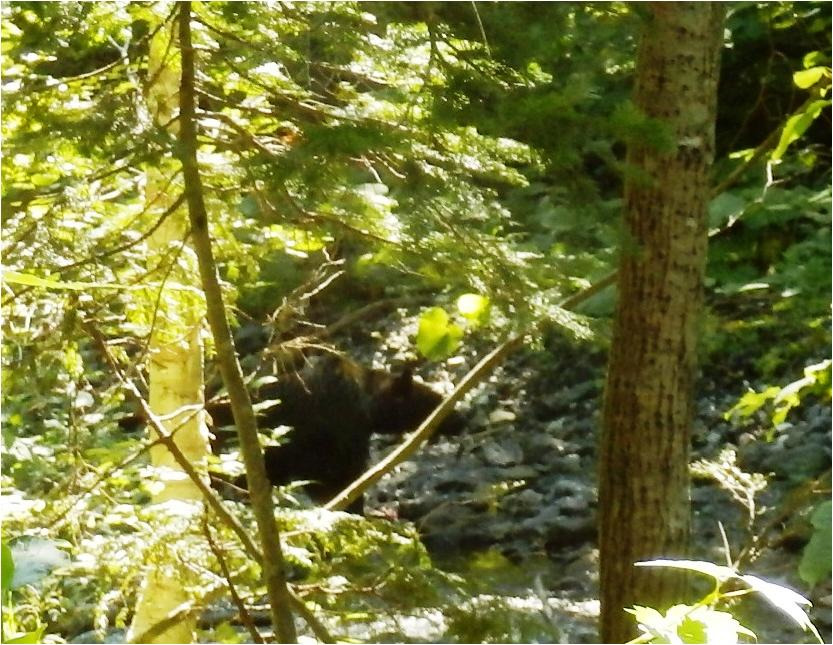 Тропа пошла к реке, минут двадцать хода по набитой в узенькой пойме стежке. Стоп мотор, экстренное торможение. На речке в тридцати метрах большой черный медведь. Ну как большой, килограмм на триста. Первый косолапый. Для хорошего снимка нужно ближе подходить, деревья мешают. Пошёл на сближение. Аккуратно, осторожно пошёл, ведь не лисицу собрался фотографировать и не бурундука, а хозяина тайги!