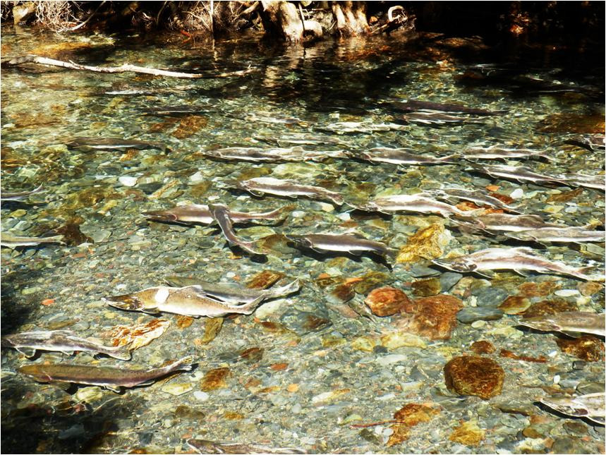 Стал бродить реку. Понятно, что медведица жрала. Горбуша в речке, не много, битая и полудохлая. Выше, речка чистая. Пять минут правым берегом и снова на левый берег. Рыбы уже больше и чувствуется запах тухляка.