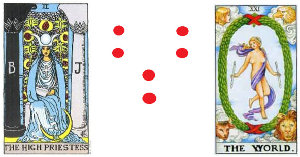 Продолжим. Видите красные точки, расположенные между картами Верховная жрица и Мир? Разумеется, они тут не просто так. Данные точки образуют весьма значимую магическую фигуру, используемую во многих магических орденах. Название этой фигуры «Большое везение», что она и делает, причём, если её перевернуть – она превращается в фигуру «Малая удача».
