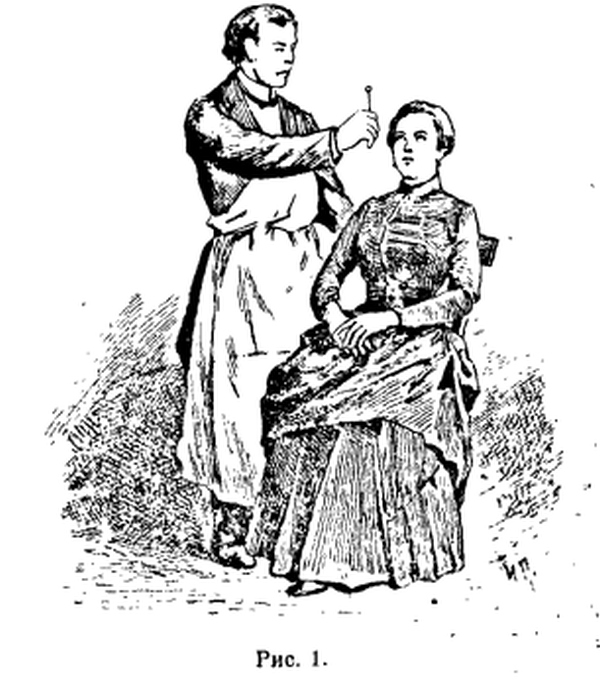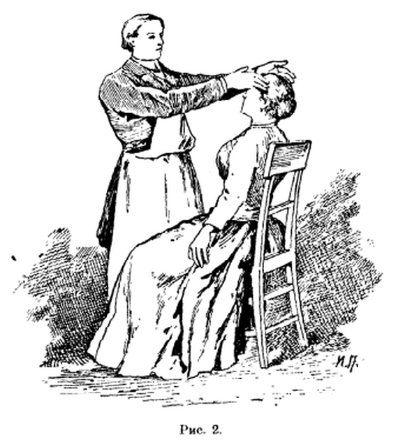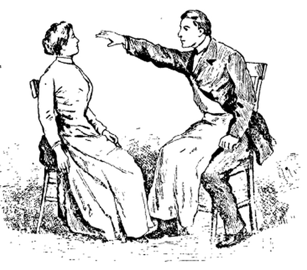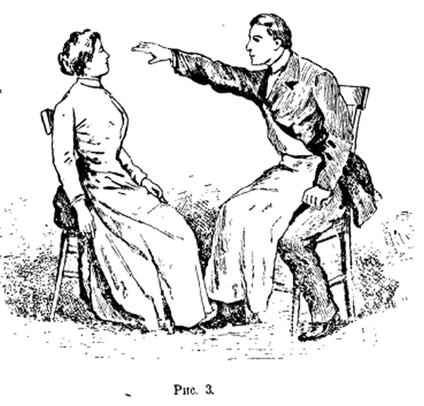 Со времён Месмера и Бреда, в Европе стало известно, что люди переходят в гипнотическое состояние под влиянием продолжительного сосредоточения своего внимания на каких-нибудь монотонных раздражениях их органов чувств. Стоит для этого например пристальное продолжительно фиксировать глазами какой-нибудь блестящий предмет хотя бы пуговку или гранёный кристалл, помещенный над переносицей(рис. 1) или фиксировать даже кончик своего носа или глаз гипнотизатора(рис. 2), или напряженно прислушиваться к бою часов, или подвергаться действию пассов (рис. 3), т. е. равномерных движений рук, проводимых перед глазами и вдаль и вблизи поверхности тела, так вскоре некоторые люди, и в особенности нервные, погружаются в гипнотический сон. Необходимым условием перехода в это состояние является продолжительное сосредотачивать внимание на монотонном раздражении. Люди рассеянные, не владеющие своим вниманием, каковы дети до известных лет и многие умопомешанные, отнюдь не могут впасть в это гипнотическое состояние, несмотря на все усилия гипнотизатора.