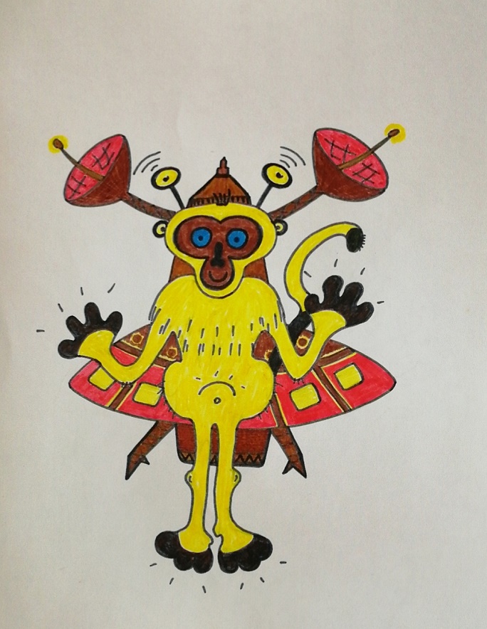 Это был умненький зверек, желтого цвета, похожий на обезьянку, с антеннами на голове. Он ходил как люди, на двух ногах, умел разговаривать и читать на всех человеческих языках. А еще он умел понимать язык всех живых существ (у него был специальный приборчик, который ему все переводил на его язык).