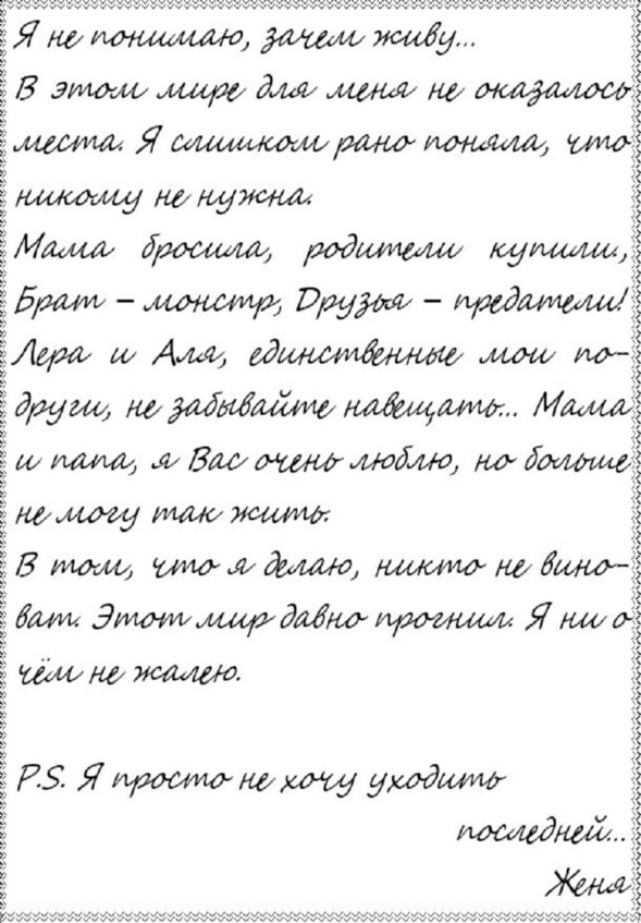 Слава Марвин дал мне почитать копию предсмертной записки подруги. Сама не знаю, почему хотела её прочитать. Может, надеялась на то, что мне станет легче, но стало только хуже. Я была раздавлена.