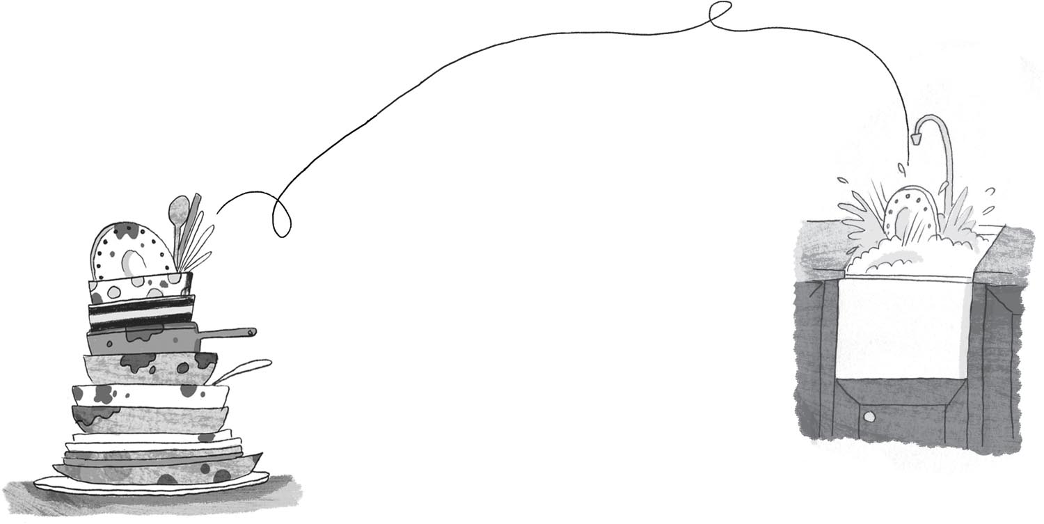 One by one, all the dirty dishes whizzed themselves into the sink and out again, piling up neatly on the table.