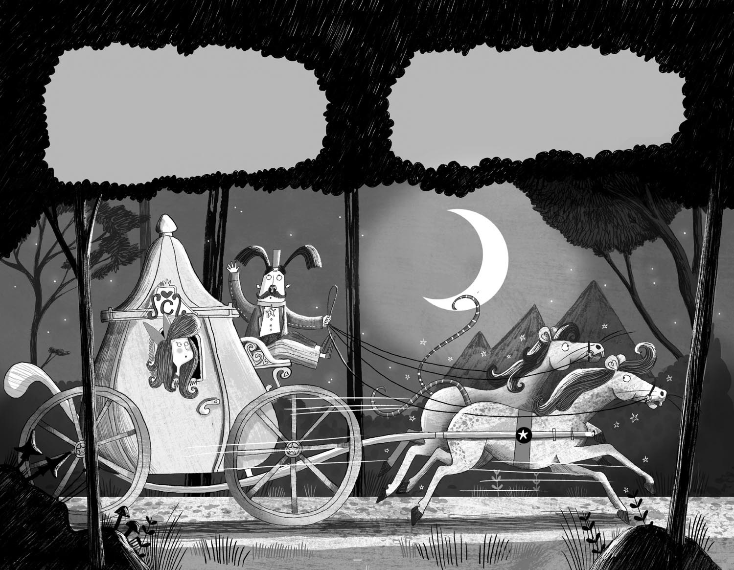 Cinders breathed out a sigh. Then she bolted out of the ballroom, ran along the hallway and leaped all the way down the marble staircase to find Sparks the footman and her two horse-mice waiting with the crystal carriage. She jumped inside, face first, and her ballgown blew up over her head, displaying her bloomers to the entire kingdom.