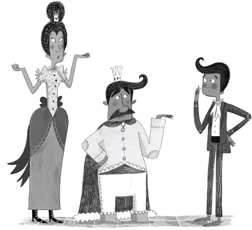 Even though she could see people dancing and eating, no one looked as if they were truly enjoying themselves. There was no laughter, no singing and the musicians were struggling to play in their tight, high collars and big, heavy wigs. At the furthest end of the ballroom, Cinders saw three thrones. Right in the middle, perched on the biggest throne, sat the king. He was a shortish, greyish, grumpy-looking man who was sulking in the middle of the biggest party his kingdom had seen in years. To his right was the queen. She was also shortish, greyish and grumpy-looking, which made her slightly skew-whiff powdered wig and ruffled rose-pink gown look really quite silly. The throne to the left of the king was empty.