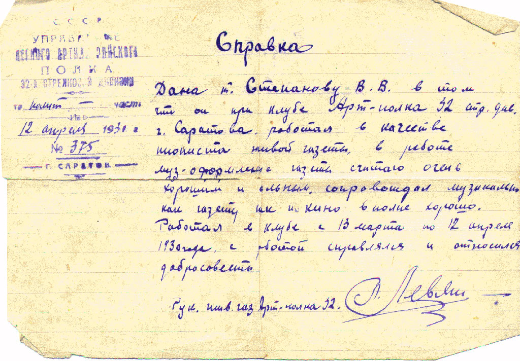 Дана тов. СТЕПАНОВУ В. В. в том, что он при клубе Арт-полка 32 стр. дав. г. Саратова работая в качестве пианиста живой газеты, в работе муз. оформления газеты считаю очень хорошим и сильным, сопровождая музыкальную газету, так и кино с 13 марта по 12 апреля 1930 г., с работой справлялся и относился добросовестно.