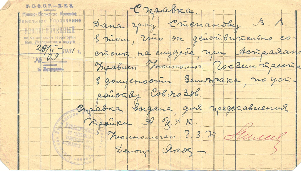Дана настоящая гр. СТЕПАНОВУ ВЛ. ВАС. в том, что он действительно состоит на службе в Управлении при Астраханском Управлении Уполномоч. «Госземтреста» в должности техника – землеустроительства.