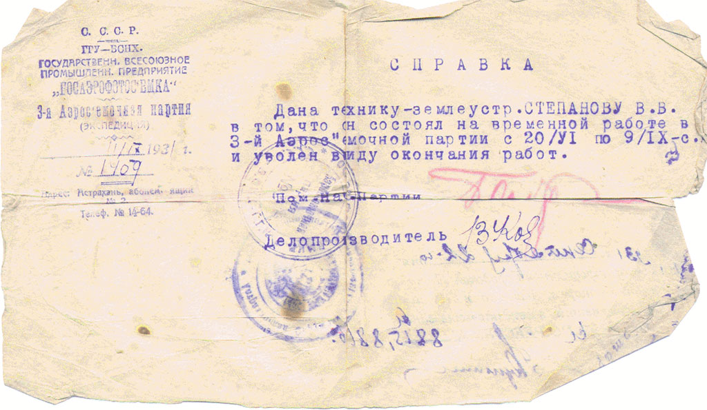 Дана технику-землеустроителю СТЕПАНОВУ В. В. в том, что он состоял на временной работе 3-ей Аэросъёмочной партии с 20.06. по 9.09. 31 г. и уволен в связи с окончанием работ.