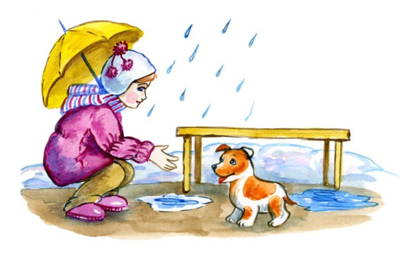 Вечером полил дождь. Девочка увидела под скамейкой маленького щенка, который был мокрым от ушей до хвоста, дрожал и жалобно скулил. Мама не разрешала даже гладить незнакомых кошек и собак, и девочка всегда её слушалась.