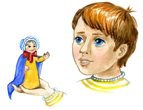 Так продолжалось много дней. Но однажды вечером, когда мама прочитала мальчику сказку и ушла, а сердитые гномы вышли на свою обычную прогулку по двери, под подушкой кто-то пошевелился. Мальчик пригляделся и увидел у себя на кровати маленькую милую старушку в плаще из тонкой синей кисеи.