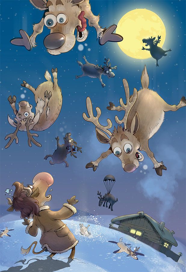 Буня чуть не оглохла от грохота. Вокруг неё падали на землю олени. Чтобы не быть раздавленной, ей пришлось отскочить под навес. Вскоре оленепад прекратился. Жители деревни выстроились в ряд, и вперёд вышел самый высокий и самый красивый олень. Он начал речь: