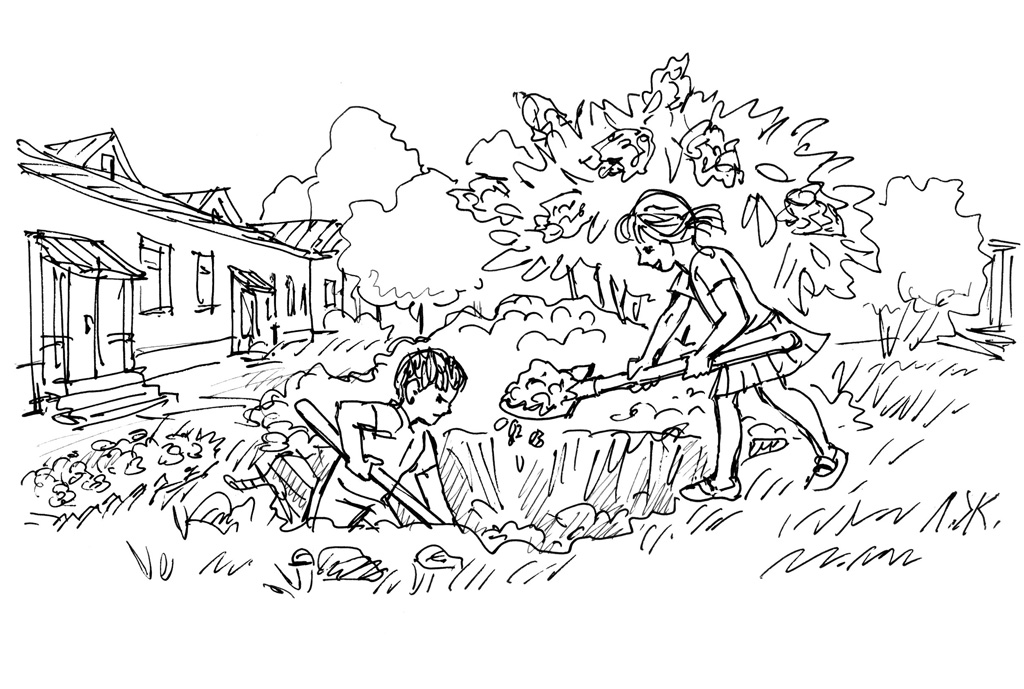 Но, продолжая свой рассказ, я все-таки вернусь к теме частной собственности. Так вот, мы, одержимые мелкобуржуазной идеей разбогатеть, как мне кажется, развившейся в пику бабушкиной – всеобщего равенства, изобретали все новые и новые способы. На сей раз решили организовать выставку – продажу собственных картин. Ну, картины – то мы нарисовать могли, правда, очень сомнительного качества, но как, а главное где устроить сам вернисаж? В доме места мало, в беседке нет стен, одни столбы, в общем надо что-то построить! У забора нашли кучу гнилых досок, тоже не вариант! Перебрав все известные способы строительства, решили соорудить нечто вроде подземного бункера. Конечно, ни о пропорциях, ни о масштабах не подумали, а просто начали копать прямо под сиренью в саду. Копали честно, от завтрака до обеда, яма получилась весьма внушительных размеров. Но пошёл дождь, бабушка позвала обедать и про яму благополучно забыли.