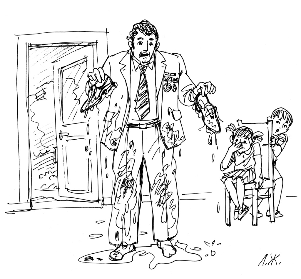 Вот и теперь приезжает дядя Андро, как всегда, с подарками, дынями и фруктами. Этакий восточный принц в парадном светлом костюме, купленном где-то в потаенных спецзакромах ГУМа, в модном галстуке и весь в орденах. Вечером уселись за стол, долго ели, пили, смеялись, вспоминали фронтовые истории. Мы тоже сидели вместе со всеми, предвкушая скорое чаепитие со слоеным Наполеоном, красовавшимся посредине стола. Конечно, можно было уже давно пойти заняться более интересными делами, но торт, да еще огромная коробка с шоколадными конфетами, привезенная тоже из каких- то особых закромов, заставляли покорно ждать и слушать бесконечную болтовню взрослых. Потом дядя Андро решил прогуляться. Было уже темно, пахло дождём и сиренью. Вдруг из темной глубины сада послышался истошный крик. Папа побежал на помощь, и через несколько минут вернулся вместе с Андро, мокрым, грязным и чертыхающимся. На полах бывшего светлого пиджака расплывались грязно-бурые пятна, с брюк стекала ржавая вода. В руках он держал тоже бывшие новые лакированные ботинки, полные вязкой глины. Мы с братом замерли, сразу сообразив, в чем дело. Но вид несчастного был настолько нелеп и комичен, да еще в ярком галстуке и при орденах, что мы, прижавшись к стульям, начали давиться от хохота. А это было уж совершенно некстати, усугубляя и без того глупейшее положение! – Там у вас в саду огромная яма с грязной водой! – Да что ты, Андро, нет там никакой ямы, наверное, ты зашёл к соседям! – Взяли фонарь, вернулись с лопатой, брошенной под кустом сирени. Папа, взглянув на нас, сразу все понял. Утром пришлось закапывать злополучную яму, навсегда простившись с идеей разбогатеть на продаже живописи. А дядя Андро, вычищенный и выглаженный, отправился на заседание.