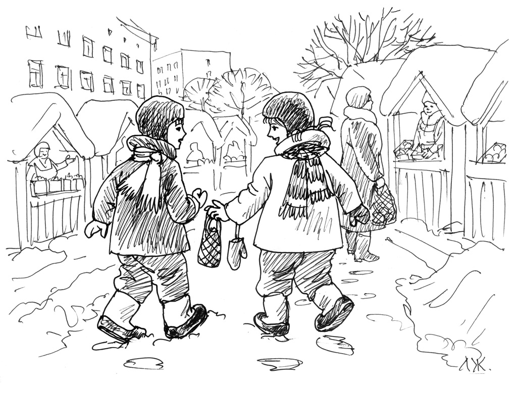 Вот, наконец, собравшись, всей компанией отправляемся на рынок. Бабушка впереди, обходит ряды со всякой всячиной, а мы уныло плетемся сзади. Занятие довольно скучное, особенно, когда видишь вокруг всякие рыночные соблазны в виде петушков на палочках или плетёных цветных корзиночек, понимая, что просить бесполезно. Бабушка непреклонно стоит на своем – Нечего всякую дрянь покупать! – Но эта самая рыночная Дрянь почему-то всегда была предметом особого искушения. Чего стоили только те замечательные мячики на резинке, набитые опилками или деревянные расписные свистульки, или поролоновые георгины. А еще пышные розочки, облитые парафином, которые почему-то ужасно воняли, но от этого не теряли своей привлекательности. Все это сверкало яркими красками на заснеженных прилавках, не давая никакой возможности отступления, и мы, конечно, начали канючить, выпрашивая деревянных курочек на круглой дощечке. Иногда бабушка сдавалась под натиском убеждения в необходимости какой-нибудь вещицы, и мы всё-таки получали корзиночку или свистульку. Вот и сейчас курочки куплены, и мы вполне довольны не зря потраченным временем.