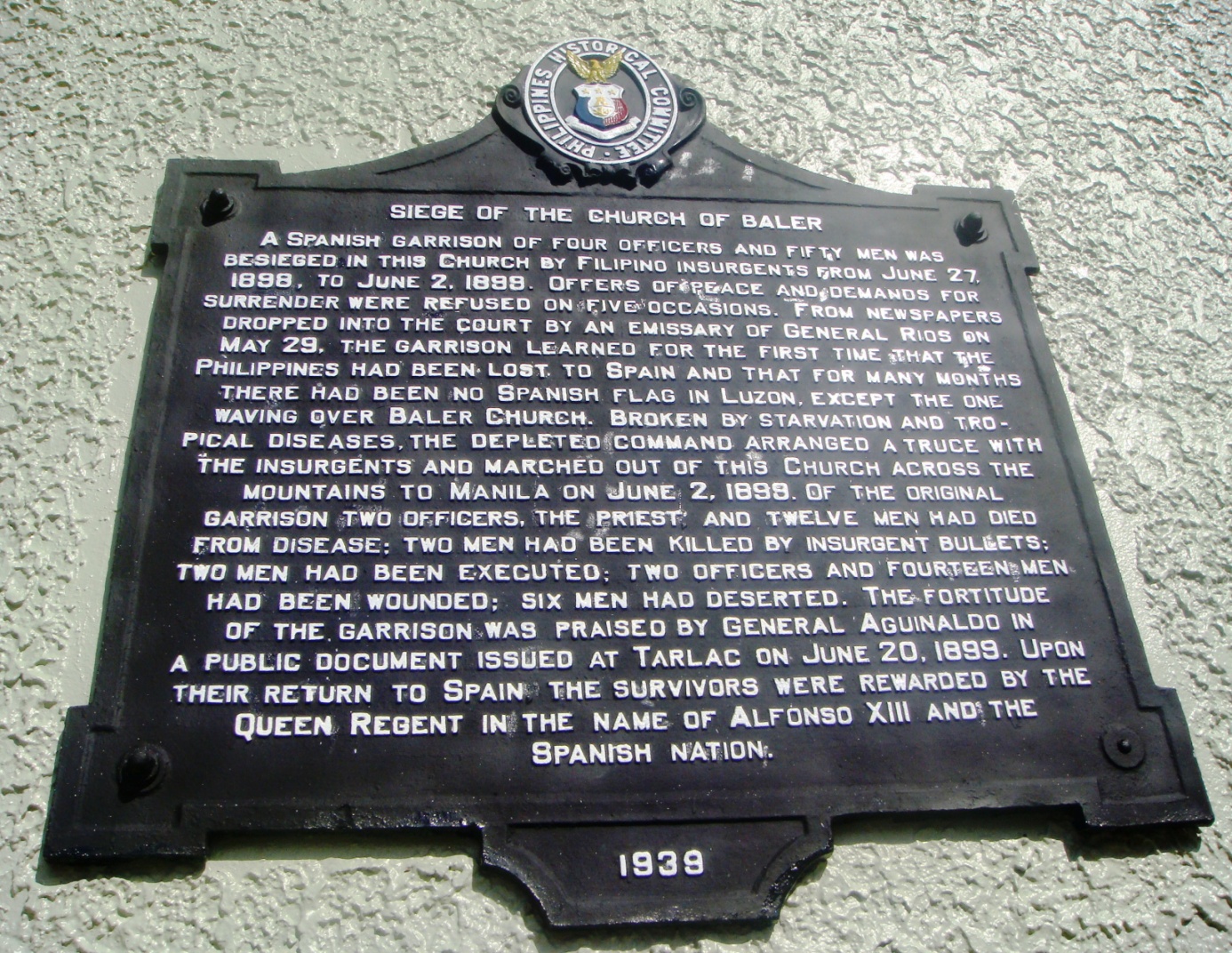 Старейшим и самым солидным зданием, универсальным признаком испанского завоевания, здесь является церковь. Это сложенное из грубого камня продолговатое, суровое и неухоженное здание, одинокая святыня славного этапа испанского суверенитета на этих злосчастных островах. Под укрытием этих стен рота испанских солдат, голодная, забытая, но непобедимая, выдержала долгие одинадцать месяцев осады в условиях страданий и героизма в последние дни испанского и первые дни американского господства на Филиппинах.