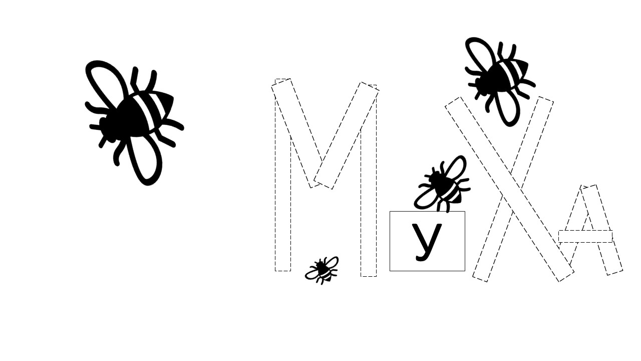 Прилетели мухи и спрятали буквы. Помоги найти буквы и прочитать слово. Назвать каждую букву в слове «муха». Посчитать, сколько в слове муха букв. Сколько слогов в слове муха? Сколько мух на картинке? Показать самую большую муху на картинке. Показать самую маленькую муху на картинке.