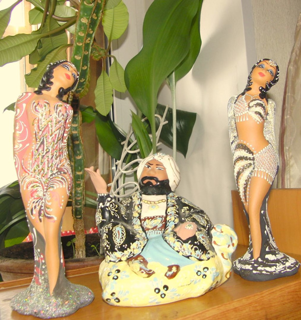 Все они были из разных мест. Казак с шашкой за поясом и казачка в цветочном венке – из Ростова на Дону; толстый глиняный бай в пестром халате, белой чалме с двумя гибкими танцовщицами в полупрозрачных платьях – из Узбекистана; маленькая стройная японочка в шёлковом розовом кимоно, украшенном крошечными голубыми птичками, держала в руках тончайший, словно сотканный из паутины, зонтик; индийская танцовщица в ярком украшенном разноцветными бусинками сари; скромная русская барышня в розовом платье и таком же чепчике из волжского города Мышкина; две боярыни в старинных кокошниках расшитых яркими нитками мулине, – из Нижнего Новгорода; стрелец с большой секирой в руках времён царя Петра; две куклы из Китая, изображающие актёров китайского театра драмы, с чёрными косичками, висящими ниже пояса, в длинных кимоно, расшитых золотыми драконами… При первом взгляде на них все думали: женщины в диковинных нарядах, а хозяйка знала, что эти куклы – мужчины.