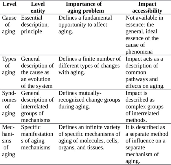 The last level is structural and its study is possible only when it is filled with biological content. With this consideration, it can be seen that the primary cause, as a principle, is manifested by several of the most common patterns – the types of aging inherent in all living systems. These types, in turn, form a number of interrelated groups of symptoms – aging syndromes, which already include specific manifestations of aging at the level of specific mechanisms that implement aging depending on specific conditions.
